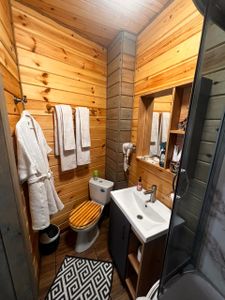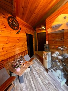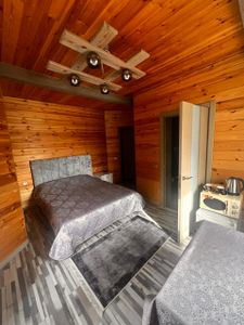 Отдельно стоящий уютный домик, деревянный, удобный, внутри есть всё необходимое для комфортного пребывания. Мягкая большая кровать, позволяющая шикарно выспаться. Отлично подходит для романтичного времяпрепровождения и семейного отдыха!